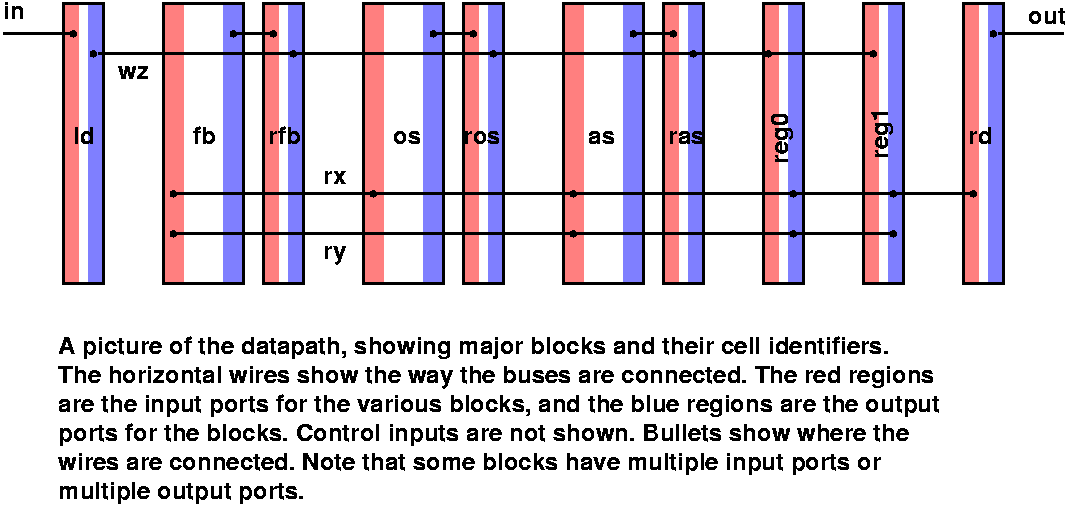 The datapath contains all the layout from lab2 and lab3. All the layout MUST BE pitch matched, otherwise wiring it up will be difficult. The layout should look like a sequence of vertical columns, with each column corresponding to a major 8-bit block. The order of the columns must be (from left to right, with cell identifier in parentheses): latch (ld); fblock (